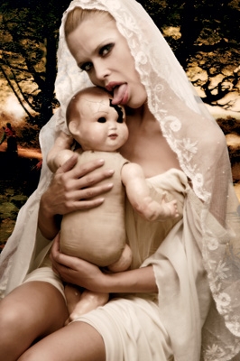 de manera independiente a la obvia Blasfemia, en el burdo émulo de nuestra Santisima Madre, y de la mirada de lujuria perversa de esta … (no se como llamarle, las perras no ofenden al creador), esta exhibicion, indica de manera indubitable la época que vivmos, el espiritu que le mueve (roling stones) totalmente satánico, una gran ramera y mercenaria, cargando en sus brazos al mono que ostenta en la pose que lo hace, no hacen mas que dejar ver a un bizarro del dios humanidad presentado en el npovus órden que sirve al espiritú de lujuria, es una imagen blasfema cierto, e indignante, empero muy representativa de la ciudad moderna del Hombre, es una imágen que ademas de asco e indignacion, debe propinarnos un real temor, por que muestra el imperio de satanás desatado.