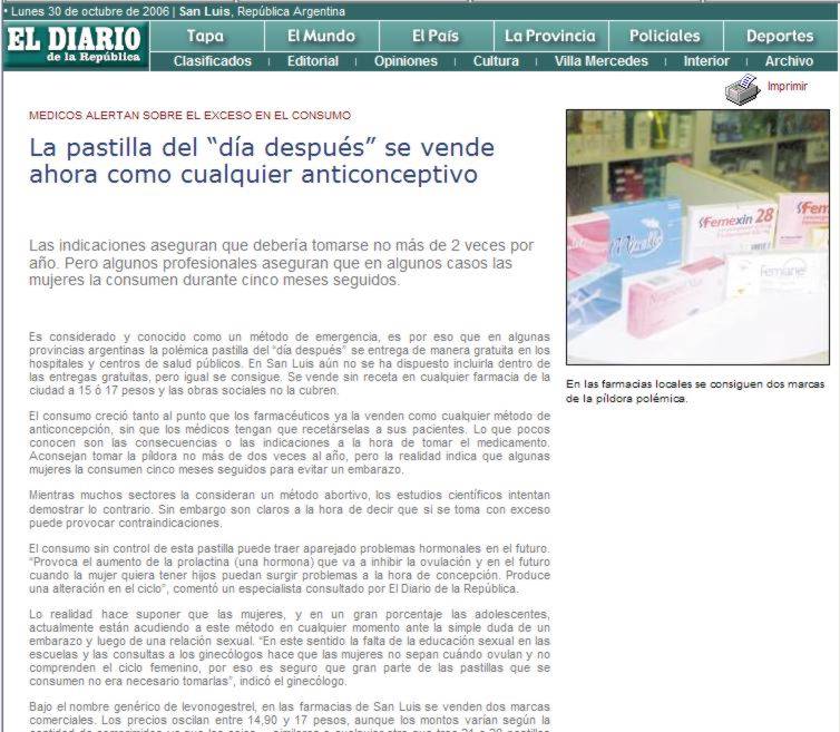 Nuestras más sinceras felicitaciones a El Diario de la República, propiedad de lafamilia gobernante en San Luis desde 1983. Porque los Rodriguez Saa, han afirmado en su edición del 30 de octubre que la pastilla del dia después es abortiva al ser anti implantatoria.