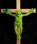 La escultura de madera de 1990 muestra a la rana crucificada de pies y manos como Jesucristo. El animal luce un taparrabo y sostiene un jarro de cerveza y un huevo en las manos.