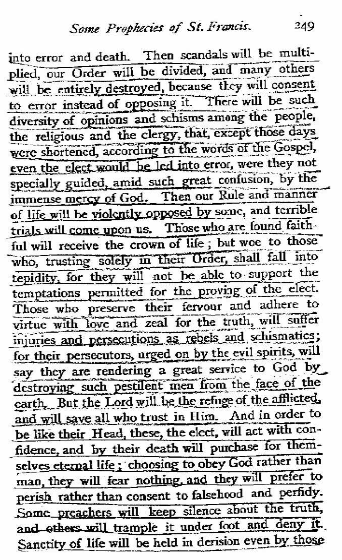 “Habrá un Papa electo no canónicamente que causará un gran cisma. Se predicarán diversas formas de pensar que causarán que muchos duden, aún aquellos en las distintas órdenes religiosas, hasta estar de acuerdo con aquellos herejes que causarán que mi Orden se divida. Entonces habrá tales disensiones y persecuciones a nivel universal que si esos días no se acortaran, aún los elegidos se perderían”.