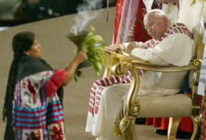 6. Wojtyla recibe la bendición de un chamán (brujo) apache en Phoenix, Arizona.