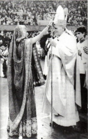 2.- Una nativa de la India (por su vestido sari) colocando amablemente algo en la frente del Santo Padre.
