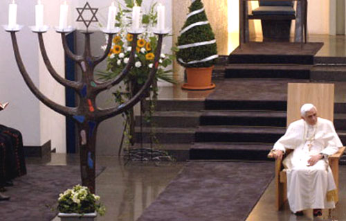 No es casualidad la sustitución del pesebre de Belén por el pinito «navideño». Y aunque esta extraña figura a primera vista es una menorah (que nada tiene que hacer en un templo católico) no es más que el descaro de los conciliares…..