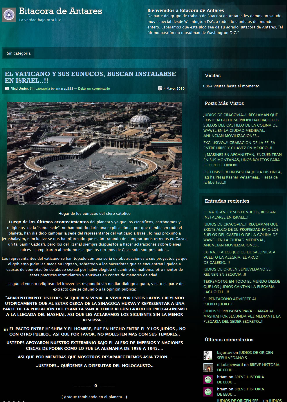 Luego de los últimos acontecimientos del planeta y ya que los científicos, astrónomos y religiosos de la “santa sede”, no han podido darle una explicación al por que tiembla en todo el planeta, han disidido cambiar la sede del representante del vaticano a Israel, lo mas próximo a jerushalayim, e inclusive se nos ha informado que están tratando de comprar unos terrenos en Gaza a un tal Samir Gaddafi, pero los del Tzahal siempre dispuestos a hacer aclaraciones sobre bienes raices le explicaron al beduino ese que los terrenos de Gaza solo son prestados..