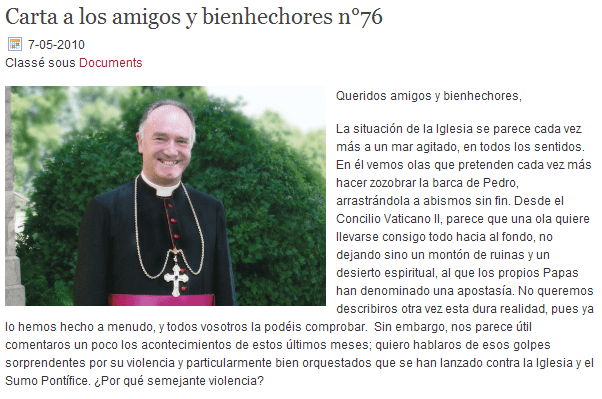 Fellay escribió: «La situación de la Iglesia se parece cada vez más a un mar agitado, en todos los sentidos. En él vemos olas que pretenden cada vez más hacer zozobrar la barca de Pedro, arrastrándola a abismos sin fin. Desde el Concilio Vaticano II, parece que una ola quiere llevarse consigo todo hacia al fondo, no dejando sino un montón de ruinas y un desierto espiritual, al que los propios Papas han denominado una apostasía.»