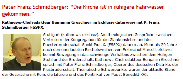 El P. Schmidberger no dice en parte alguna de la citada entrevista que «al lado de JPII, Benedicto es mejor». Lo que dice es que, con Benito XVI, la Iglesia navega en aguas más tranquilas, es decir que hay menos agitación en la Iglesia, lo que no necesariamente signifique algo mejor.