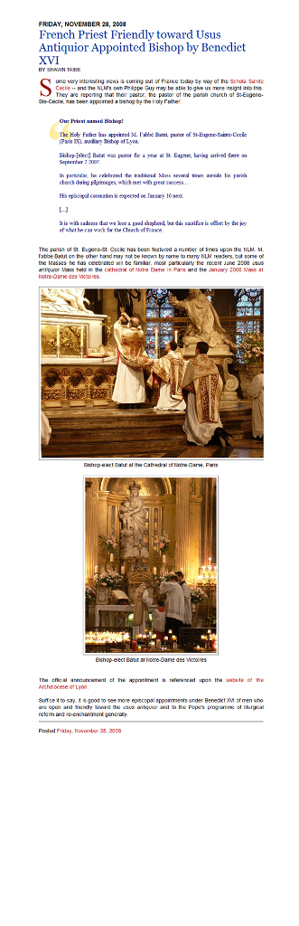 Por otro lado, el sitio New Liturgical Movement, en noviembre de 2008 hace referencia a dicha celebración y nos informa que el oficiante, el sacerdote Jean-Pierre Batut, Párroco de la parroquia de Saint Eugène-St Cecile, fue nombrado obispo auxiliar de Lyon y que su consagración episcopal se esperaba para el 10 de enero de 2009.