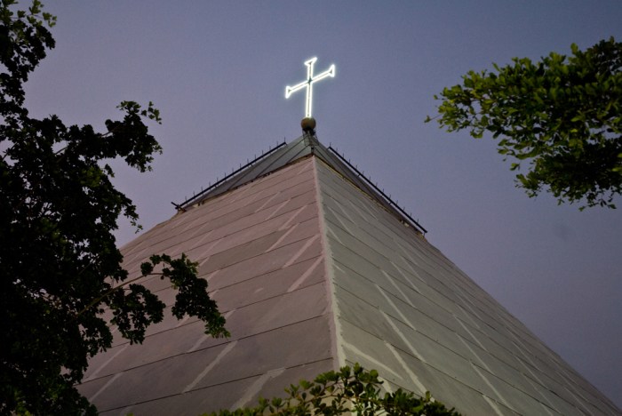 La verdad esa iglesia tipo piramide no se si es un simbolo masonico, egipcio o maya lo que me parece un mamarracho de pesimo gusto