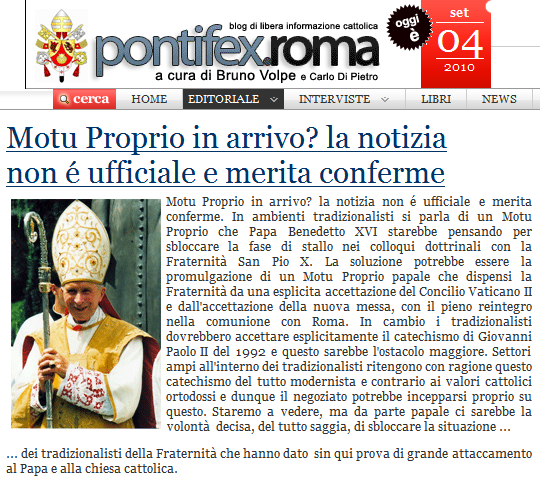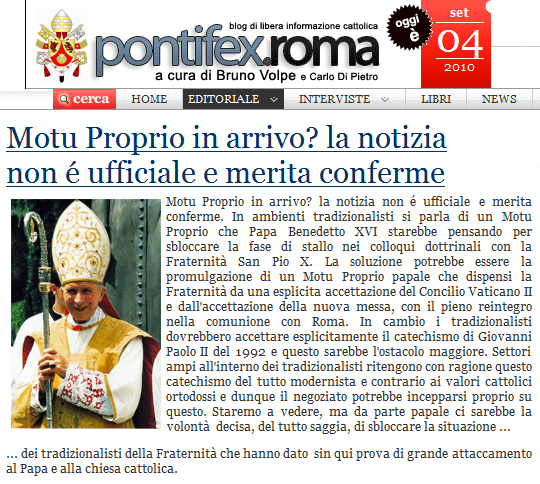 La noticia no es oficial y merece confirmación. En ambientes tradicionalistas se habla de un motu proprio que el Papa Benedicto XVI estaría pensando para desbloquear la fase de estancamiento en las conversaciones doctrinales con la Fraternidad de San Pío X. La solución podría ser la promulgación de un Motu Proprio Papal que dispense a la Fraternidad de una aceptación explícita del Concilio Vaticano II y de la aceptación de la nueva Misa, con el pleno restablecimiento en la comunión con Roma. A cambio, los tradicionalistas deberían aceptar explícitamente el catecismo de Juan Pablo II de 1992 y éste sería el obstáculo mayor. Amplios sectores al interior de los tradicionalistas afirman con razón, que este catecismo completamente modernista es contrario a valores católicos ortodoxos y por lo tanto las negociaciones podrían quedar estancadas en ello. Vamos a ver, pero de la parte papal se sabe de la decisiva voluntad, del todo sabia, de desbloquear la situación de los tradicionalistas de la Fraternidad que han dado hasta ahora muestra de un gran apego al Papa y la Iglesia Católica.