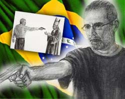 Los dibujos son un autorretrato de Gil Vicente disparando contra personalidades mundiales como el actual pontífice, el ex presidente norteamericano George W. Bush, la Reina Isabel II de Inglaterra, el presidente de Irán, Mahmoud Ahmadinejad, el ex premier israelí Ariel Sharon y el ex secretario general de la ONU, Kofi Annan. En la política local, Gil Vicente eligió a Lula y a su antecesor, Cardoso. Pero Lula es el único que en el dibujo no recibe un disparo, sino que es asesinado por el autor por degüello, con un cuchillo.