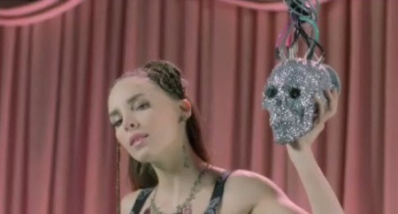 Para completar la sobrecarga Illuminati de este video, la cabeza típica de Baphomet se ubica estratégicamente sobre el trono infernal de Belinda.