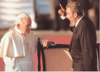 No obstante, Juan Pablo II, en la misma alocución, insistió en sus elogios llegando a aseverar que mediante esa trilogía las “autoridades” de Cuba – o sea, los miembros del régimen castrista – colocarían “pilares del edificio de la paz” e incentivarían el “crecimiento armónico del cuerpo y de espíritu». Con lo cual el Pontífice pareció ignorar que Fidel Castro, el Che Guevara y sus secuaces, en nombre de esa trilogía, provocaron la destrucción y la muerte, “del cuerpo y del espíritu”, de tantas personas en tantos países de América Latina, África y Asia.