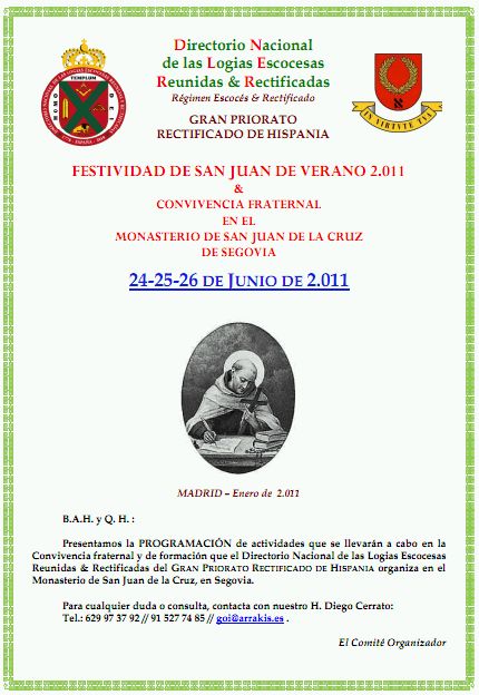 Donde descansan los restos del Doctor Místico, en el monasterio San Juan de la Cruz de Segovia (España), se tiene programado un encuentro masónico del 24 al 26 de junio de 2011, a pesar de que la masonería se encuentra firmemente condenada por la Iglesia Católica. Lo más aberrante es que al cierre del mismo se concluirá con una misa en la capellanía del monasterio que precederá a la comida final de los masones.