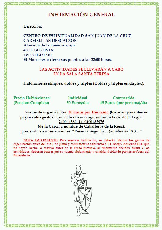 ¿Estará enterada la Santa Sede de este evento denunciado en otros blogs? Lo peor de este escandaloso asunto es que no es la primera vez que se realiza un encuentro masónico en ese monasterio («centro de espiritualidad») de los carmelitas descalzos, como podemos ver en esta noticia de la logia «Caballeros de la Rosa» que tomamos de su sitio: