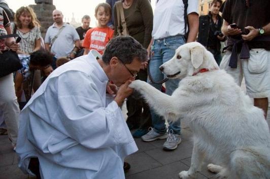 Italia, 4 de octubre de 2011, fiesta de San Francisco de Asís: sacerdote recibe la bendición del perro.