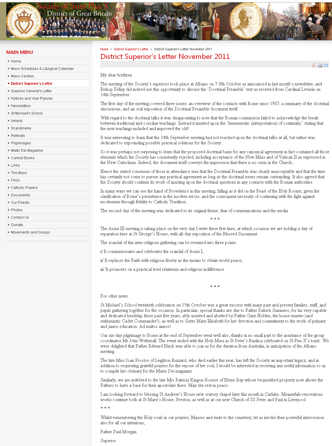 Escribiéndo en su carta mensual de Noviembre de 2011, el P. Morgan dice: