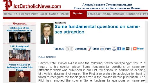 En el artículo donde se retracta y pide disculpas, Ávila afirma que su columna no representan la posición de la USCCB (Conferencia de Obispos católicos de los EEUU) y no estaba autorizado para su publicación. «La enseñanza de la Sagrada Escritura y el Catecismo de la Iglesia Católica señala que todas las personas son creadas a imagen y semejanza de Dios y tienen una dignidad inviolable. Del mismo modo, la Iglesia proclama la santidad del matrimonio como la unión permanente, fiel y fructífera entre un hombre y una mujer. » dijo.