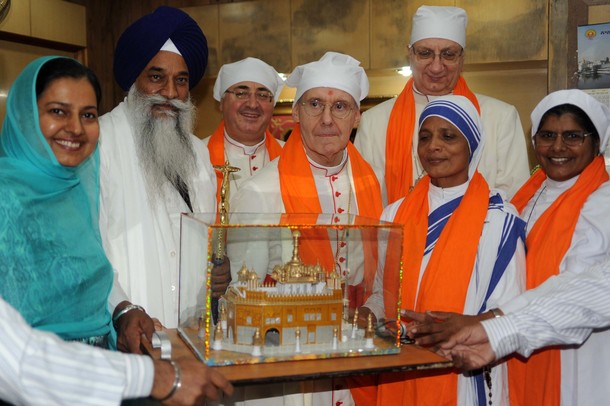 India sumo sacerdote sij de Sri Akal Takhat Sahib, Gurbachan Singh (2L) presenta un modelo del Templo de Oro es el Presidente del Consejo Pontificio para el Diálogo Interreligioso de la Ciudad del Vaticano el cardenal Jean-Louis Tauran (C) durante una visita a El Templo Dorado sij de Amritsar Santuario el 11 de noviembre de 2011. Tauran, junto con cuatro miembros visitaron la ciudad para asistir a un seminario religioso en el sijismo y cristianos Celebrada en Guru Nanak Dev University, en Amritsar el 12 de noviembre