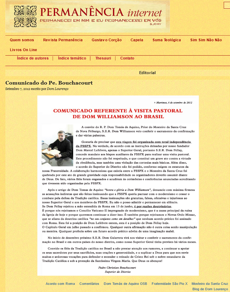 Para varios amigos esta portada con la transcripción, sin más, del triste comunicado del P. Bouchacourt, implica una cercanía de posiciones con el acuerdismo de Fellay, del cual Bouchacourt es su esbirro.