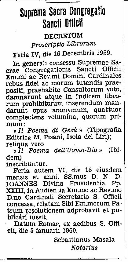 En primer lugar, el poema fue puesto en el Índice de la Iglesia de libros prohibidos en 1950, antes de que Roma fuera neo-modernista en los años 1960. La razón dada para la condena era la idealización y el sentimentalismo de los hechos evangélicos. En segundo lugar el poema es acusado de un sinnúmero de errores doctrinales. En tercer lugar el Arzobispo Lefebvre se opuso a la poesía ya que da demasiados detalles físicos de la vida cotidiana de Nuestro Señor lo cual lo hace demasiado material, y nos pone demasiado lejos del nivel espiritual de los cuatro Evangelios.