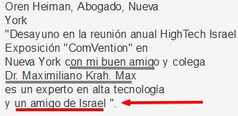 Su amigo Oren Heiman, está proponiéndolo como «amigo de Israel» para ayudar a su candidatura; como amigo de la colectividad.