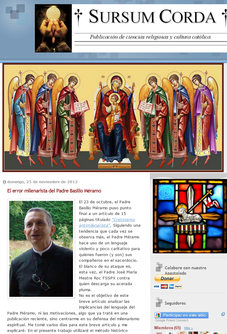 De pura casualidad me enteré recientemente de un artículo titulado «El Error Milenarista del Padre Méramo» aparecido el 25 de Noviembre de 2012 en el blog Sursum Corda firmado por un tal Raúl Miguel (lo cual parece más un seudónimo o simplemente alguien que no quiere identificarse con su apellido), que espero que sepa dar la cara y revelar su identidad la cual de algún modo quiere encubrir, pues es mucho mas fácil tirar la piedra y esconder la mano como hace el pájaro milano.