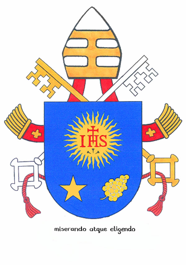 Lombardi, ha comunicado cuales son el escudo y el lema del nuevo pontífice, que son los mismos utilizados desde su consagración episcopal El escudo tiene fondo azul y lleva los mismos símbolos de la dignidad pontificia de Benedicto XVI: mitra colocada entre dos llaves de oro y plata en forma de cruz, unidas por un cordón rojo. En lo alto campea el emblema de la orden del Papa: la Compañía de Jesús: un sol radiante, con el monograma de Cristo en rojo. La letra H lleva una cruz encima y las puntas son tres clavos negros. Abajo, una estrella y una flor de nardo. La estrella, según la tradición heráldica simboliza a la Virgen, Madre de Cristo y de la Iglesia, mientras la flor de nardo indica a San José, patrono de la Iglesia universal. En la tradición iconográfica española, efectivamente, San José lleva una vara de nardo. Con esos símbolos el Papa manifiesta su amor por la Virgen y San José.