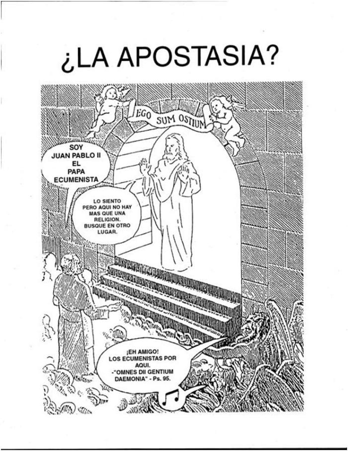 Nosotros no juzgamos al Papa, sí juzgamos el error y la herejía del Papa, es la fe la que juzga: «Estamos obligados a juzgar según la Tradición, según la fe de la Iglesia, según la enseñanza del Magisterio de la Iglesia a fín de saber si tal o tal documento es conforme con la Ortodoxia que la Iglesia nos ha enseñado siempre.» (Un Evêque parle, Ed. D.M.M. 1974, tomo 1, p.237), no hacemos más que seguir la advertencia de San Vicente Ferrer: «Dice Santo Tomás que cuando surge algún error entre los cristianos, o amenaza peligro contra la fe, todo cristiano está obligado, si quiere salvarse, a enfrentarse con tal error o peligro, confesando públicamente la fe, en la medida que le sea posible» (San Vicente Ferrer, Biografía y escritos, BAC. Madrid 1956, p.452). El peligro y el error contra la fe es la herejía, el cisma y la apostasía de Juan Pablo II que son un hecho manifiesto, para el que quiera ver.