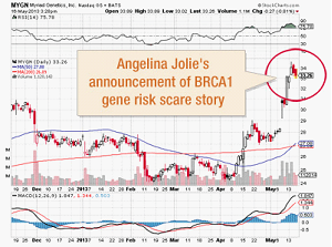 Los precios de las acciones de Myriad suben, más rentable una fusión se convierte para sus actuales propietarios. Así que la publicidad de Jolie acaba de generar desconocidos millones de dólares en valor para las personas que reclaman un monopolio de patente sobre los genes del cáncer de mama que residen en los cuerpos de las mujeres.