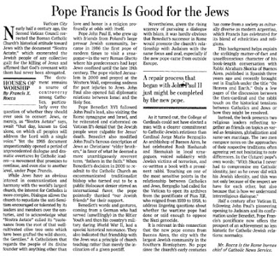 Es relevante en este aspecto que el nuevo Papa viene de Buenos Aires, la ciudad con la comunidad judía más grande en el hemisferio sur. Ningún Papa desde los primeros siglos de la Iglesia ha venido de una sociedad culturalmente diversa como la Argentina moderna que Francisco homenajeaba por su mezcla de etnias y religiones.
