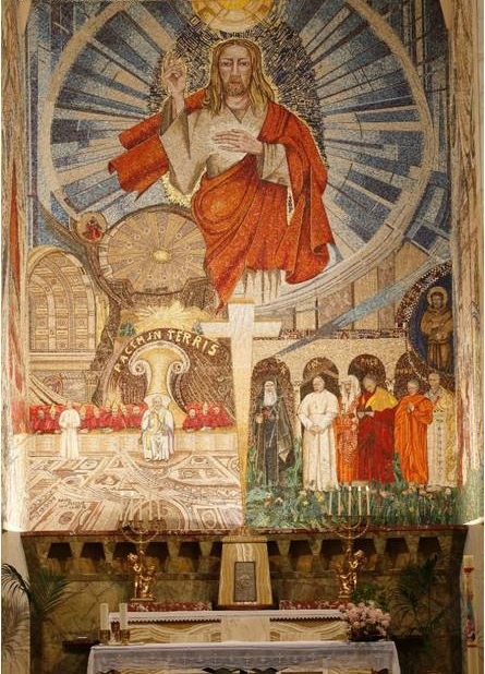 Debajo, en otro plano, con unas extrañas perspectivas del interior de la Basílica de San Pedro como fondo, aparece un banco con cardenales y obispos y delante la figura de un Papa; parece Pio XII, por la figura (que no distingo bien en las fotos), aunque si lo que se representa es el aula del Vaticano II supongo que el Papa representado en el ángulo izquierdo será Pablo VI; a la derecha, más al centro, sentado en un trono, el Papa Juan XXIII; sobre su cabeza hay una inscripción con el nombre de la encíclica Pacem in Terris. Marcando el eje de mosaico, una cruz separa esta escena de la del ángulo opuesto.