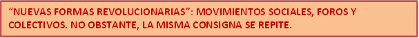 Deliberadamente en esta parte hemos omitido las imágenes que ilustren una convergencia ideológica (política ideológica) en la acción (praxis, práctica revolucionaria) pues contienen los nuevos postulados revolucionarios que como ineditos factores de transformación social no serian entendidos en su plenitud y verdadera funcionalidad revolucionaria, sin antes haber desarrollado los argumentos que hemos considerado imprescindibles. Ni siquiera hemos entregado los categorias que expliquen que es el comunismo, el socialismo y el anarquismo. Y esta circunstancia no es por que consideremos que el lector ya las maneja. Tres son las razones para ello. En primer término por una economia de ideas colaterales, que para uno de los objetivos centrales de este trabajo, producirían una desviación: dar a conocer el nuevo socialismo. En segundo lugar, reafirmar que en este nuevo socialismo siguen incolumes los cuatro objetivos centrales del comunismo previo a la caída del muro de Berlín y que recordemos son: