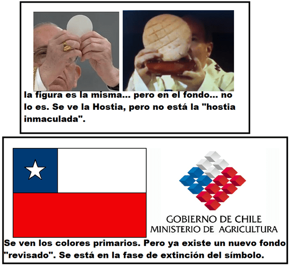 El deconstruccionismo fue pensado por Jacques Derrida y en la práctica, es como pelar una cebolla. Porque consiste en «modificar» las formas de expresión de un símbolo, en forma sucesiva. Es irlo deconstruyendo capa por capa. De esta manera, sin ser perceptible desde un comienzo porque las formas primarias del símbolo son reconocibles, se va modificando su representación en una regresión que llevará inevitablemente a la extinción del «símbolo». Al contrario de la «destrucción» directa que implica la supresión inmediata del «símbolo» y la consiguiente perdida de «formas y fondo»; la «deconstrucción» gana nuevas formas al «revisar el fondo». Veamos los siguientes ejemplos.