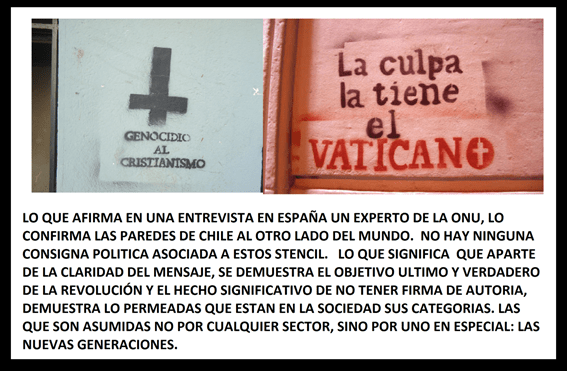 3.- Reiteramos algo ya señalado; el nuevo escenario sobre el cual se desarrolla el nuevo modelo revolucionario… es su mejor aliado: la modificación de la relación entre el intelecto y la realidad, la perdida de la fe, la impiedad temeraria y descaradamente expuesta, la desacralización de lo sagrado, la negación de las verdades reveladas por «omisión» intencional, la «modificación» también intencional del culto sagrado que conlleva a anular el homenaje de adoración personal y «público» a Dios, etc. Vemos por ejemplo, como las modificaciones del culto, hacen realidad desde el interior de la Iglesia, la antigua consigna de los comunistas de la guerra civil española: «ningún hombre de rodillas…» solo falta concretar la última parte: «… y ninguna Cruz de pie«. Pero desde el exterior «desde la sociedad civil»; esa es la etapa en la que se está trabajando ahora. Las leyes de libertad de culto y anti discriminación apuntan en esa dirección. En Chile el candidato socialista a senador por Santiago oriente C. Andrade, ya lo dijo en el nuevo lenguaje revolucionario: «he visto los colegios de la comuna de Puente Alto y todos tienen una gruta con una Virgen. Esa es una imposición al resto de la ciudadanía».