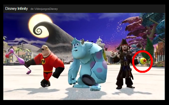 Juego infantil Disney Infinity. La espiral sobre la luna. La pelota tiene los tres colores de la demonología; azul (el cielo del demonio) amarillo (el lugar del demonio: infierno) la estrella roja (símbolo del sacrificio humano en rituales satánicos, símbolo también de la subversión).