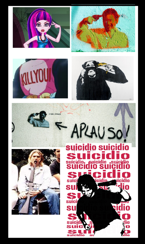 El gesto del suicidio: 1.-serie Dragon Ball para niños (llamado literal al suicidio). 2.- Juguetes Monster high para niñas. 3.-Música para adolescentes: grupo nirvana. 4.- Stencil callejeros.