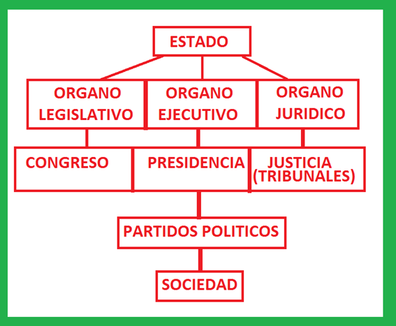 Y como consecuencia de esta grave omisión, la revolución política que es la fuente que organiza toda transformación social, la justifica con su teoría y la lleva a la práctica con su acción; no es asociada a la cultura, a la costumbre, a las organizaciones sociales que no operan dentro de los partidos políticos y al margen del orden social, ni a nada que no tenga directa relación con lo formal desde el punto de vista de lo que se considera como «la real participación en política». La organización político-formal a la que nos referimos y que guarda directa correspondencia con la organización política superior, que es el Estado; y que se dan a sí mismos la mayoría de los países, es la siguiente: