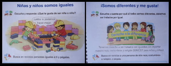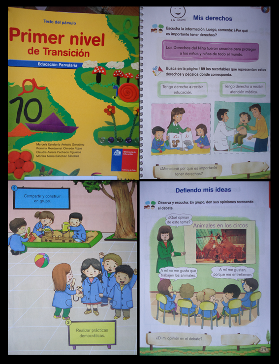 texto oficial del ministerio de educación de Chile, para niños en edad preescolar: 4 y 5 años. Los niños aún no saben leer y escribir. Categorías que se enseñan: (la palabra deber, no existe como categoría para asimilar lo que se enseña) -derechos de los niños- a través de ellos se asimilan conceptos de homogeneización mundial. Derechos de los animales: asimilación del hombre con la naturaleza. Perdida de las diferencias entre la naturaleza del hombre y el resto de los seres. Democracia comunitaria (concepto del neocomunismo y el neoconsejismo): se orienta y se dice en forma textual : a «realizar prácticas democráticas» a través de –textual- «construir en grupo». No participar. La nueva democracia –entiéndase socialismo- porque así lo señalan las nuevas categorías –y los textos del neosocialismo- «se construye, es una construcción de la comunidad».