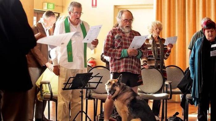 «Una visita por primera vez llegó tarde al servicio católicos Inclusive en South Yarra con una grande y bien entrenado pastor alemán. Cuando el pan y el vino consagrados se pasa alrededor, el visitante tomó el pan y se lo dio a su perro.