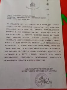 El saludo lo firma Parolín, que como sigue sin aparecer, convaleciente, no lo ha firmado Parolín. No sé quién lo habrá firmado. Cualquiera de Secretaria de Estado. Una rúbrica, un sello, y ya está. Un saludo cordial como el que se le mandaría a los asistentes de cualquier cosa.