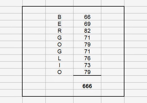 Es muy curioso que el valor numérico de la palabra BERGOGLIO, en un código universalmente difundido que trasciende los diversos idiomas, sea 666; más aún cuando para lograrlo no haga falta aditamento alguno. Al efecto, como dijimos, antiguamente se tuvo que recurrir a «Nerón César o Dioclesiano Augusto», mientras que aquí se trata de un apellido a secas.