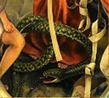 Y… se nos hace imposible no ver que un cierto «aire» tiene. Los ojos cuando miran hacia abajo, como contemplando a la serpiente a la que con su pie, parece estar tocando o acariciando, más que aplastando, como ya vimos.