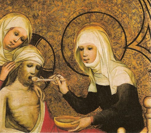 Y sucedió una cosa extraordinaria: que el duque no vio al gafo repugnante que Isabel había puesto allí para cuidarle, y acariciarle y sanarle, sino al mismo Cristo crucificado.
