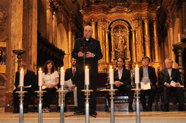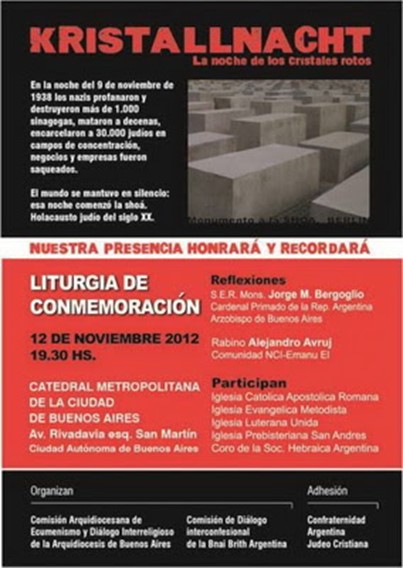 « Cristianos y judíos conmemoraron el lunes 12 de noviembre en la catedral metropolitana de Buenos Aires un nuevo aniversario de la Noche de los Cristales Rotos o Kristallnacht, considerado el primer pogrom antijudío y el inicio del Holocausto judío. La liturgia, organizada por la Comisión de Ecumenismo y Diálogo Interreligioso y la B´nai B´rith Argentina, contó con reflexiones del primado argentino, cardenal Jorge Bergoglio y del rabino Alejandro Avruj, de la comunidad NCI-Emanu El. La recordación se fundamentó en el texto De la muerte a la esperanza, escrito por el rabino León Klenicki y el teólogo Eugene Fischer, y actuó el coro polifónico de la Sociedad Hebraica Argentina. Participaron, además, representantes de las iglesias Evangélica Metodista, Luterana Unida y Presbiteriana San Andrés. »