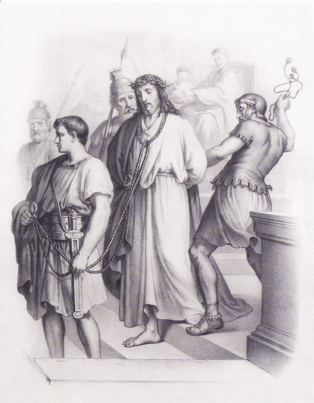 Mira, alma: apenas se profiere la sentencia, cuando los ingratos judíos arrebatan de allí al inocentísimo Jesús, le desnudan la vestidura vieja y asquerosa que le habían puesto por burla y mofa; le visten su propia túnica, para que todos le conozcan y desprecien; le vuelvan a poner la corona con inhumana crueldad y le cargan en sus lastimados hombros una pesada Cruz.