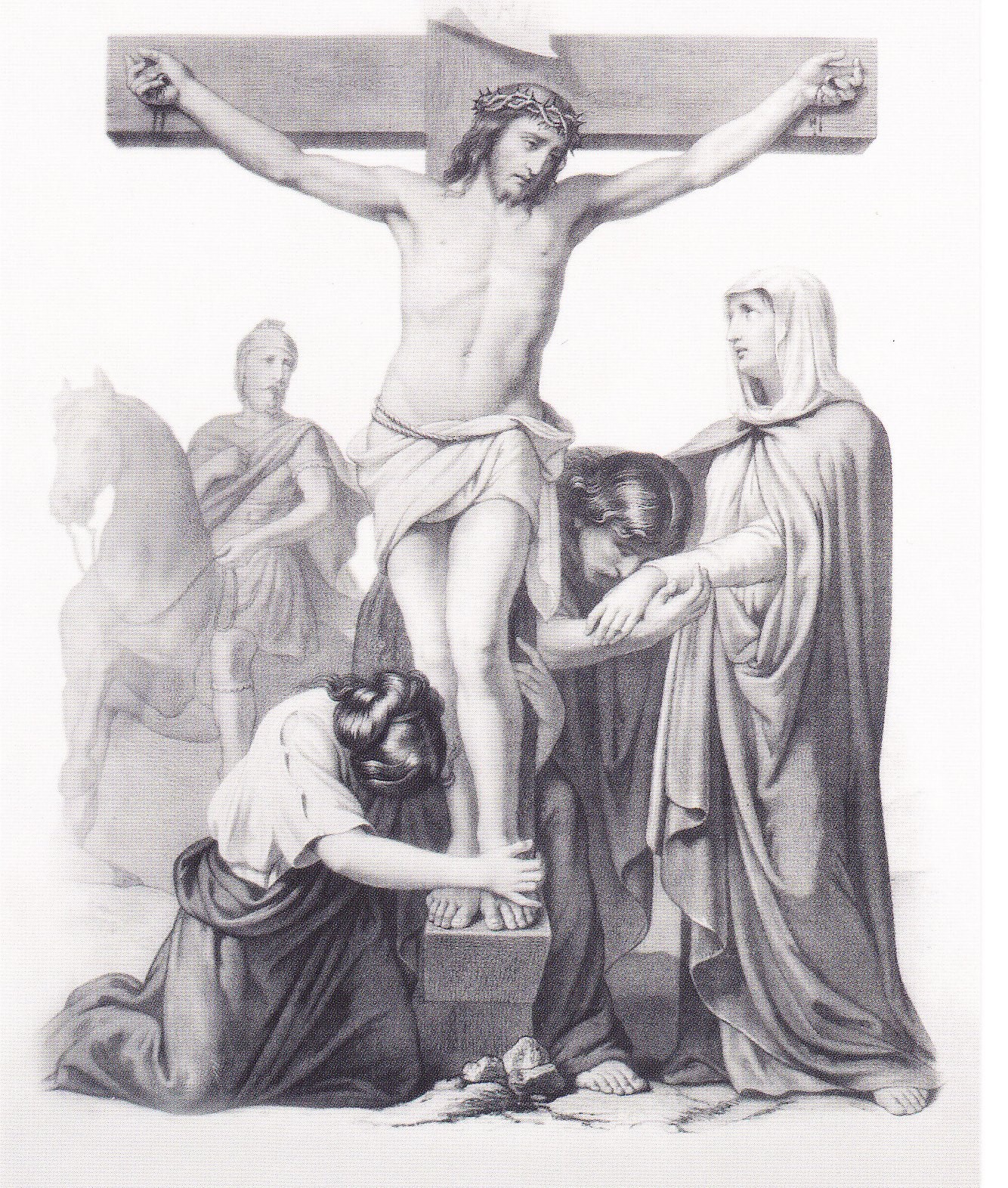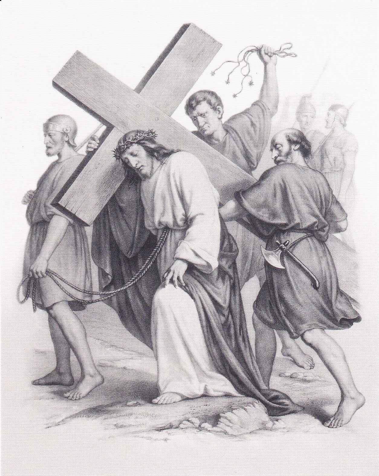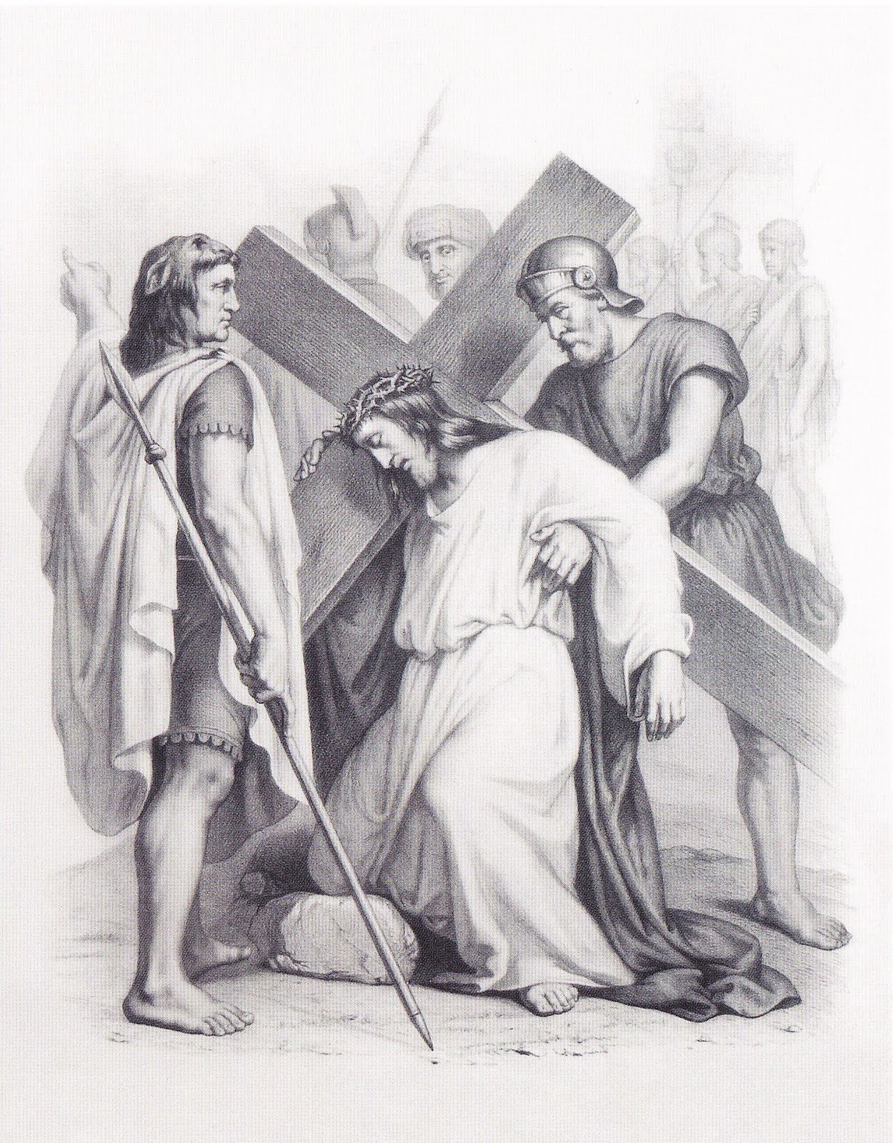 Mira aquel lugar donde nuestro humildísimo Jesús, debilitado por la sangre que le faltaba y fatigado con el peso, da en tierra con la Santa Cruz. ¡Ay! ¡Con qué rigor tratan aquí a la Majestad humillada! En vez de ayudarle, le dan de puntapiés, le tiran la soga del cuello, le arrastran de los cabellos y barba, se burlan y ríen de su poder; pero el pacientísimo Jesús espera en tierra que alguno compasivo le ayude a levantar… Ve, alma, si quieres cargar la Cruz con Él.