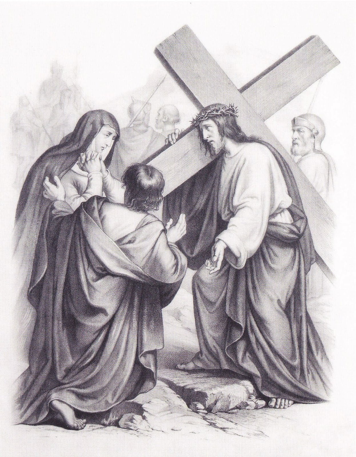 Considera el lugar donde nuestro dulcísimo Jesús encontró a su afligida Madre, traspasada de dolor. Mas ¡ay! ¡Qué tristísimos sentimientos se repetirían en aquellos dos amantes corazones! ¡Cual quedaría el Hijo, viendo la angustia de su amorosa Madre! ¡Y cual quedaría la Madre, al ver que el dueño de su Corazón, que la había enseñado a amar, iba penetrado de dolor y cubierto de heridas!