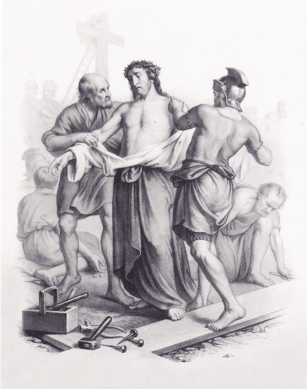 Ya estamos en la cumbre del Calvario. Contempla el lugar donde mandan a Jesús soltar la Cruz y desnudarse. Pero pareciéndoles que se demora, se arrojan sobre Él como rabiosos lobos; le arrancan el manto, le sacan la túnica por la cabeza con tal furia que enredándosele en la corona con los tirones que le dan, le derriban en tierra y le arrastran hasta quebrarle las espinas, cuyas puntas quedan internadas en su sagrada cabeza. Queda el divino Salvador desnudo, destilando sangre y temblando de frío y vergüenza.