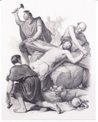 Barrenada la Cruz y preparados los clavos, comienza el sacrificio. Mandan con burla al inocente Jesús se extienda sobre la Cruz para enclavarle. Obedece gustoso. Le crucifican. Mas ¡ay, dolor! ¿Pero cómo? A fuerza de martillo le clavan una mano, cuyos golpes llegan hasta el alma y resuenan en el corazón de su afligida Madre; mas como por haberse encogido el cuerpo no alcanzase la otra mano y pies al barreno, le tiran con fuertes sogas hasta descoyuntarle los huesos. Queda el moribundo Jesús en mortales agonías. Pero más, dan vuelta la Cruz; se sientan encima para remachar los clavos ¡qué inhumanidad! El rostro pegado a un suelo de huesos asquerosos. Las espinas de la frente y cerebro oprimidas entre el suelo y la Cruz, dí, si puedes ¿dónde se enterrarían?