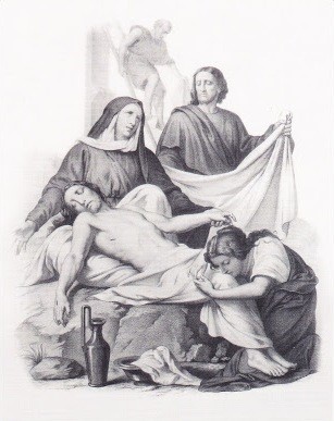 Acabadas las penas de Jesús con su muerte, siguen las de María. Allí cerca miraba esta afligida Madre a su difunto Hijo, triste y sola, sin tener quién lo bajase de la Cruz. Le alivia Dios esta pena enviándole dos discípulos ocultos que lo desenclavan, Pero ¡Ay! ¡Qué sentimiento al ver en sus brazos difunto al Hijo querido de sus entrañas que tan tiernamente amaba! ¡Qué doloridos coloquios! ¡Qué tiernos ayes no exhalaría! ¡Cómo correrían las lágrimas sobre aquel frío cadáver mientras registraba las llagas, besaba las heridas y desenredaba el pelo amasado con sangre seca!